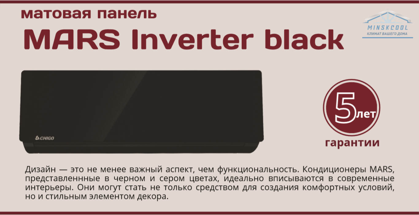 Среди богатого ассортимента кондиционеров особое внимание привлекает серия MARS, представляемая в элегантном черном цвете. Это устройство не только функционально, но и способно гармонично вписаться в любой интерьер.